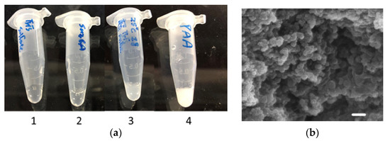 The silica-forming ability of the fused R5 peptide was examined by adding freshly prepared silicic acid to the R5-SazCA solution; the silica particles formed within seconds (image 3, Figure 2a). The negative controls containing storage buffer or SazCA solution did not result in silica formation (image 1 and 2, Figure 2a), clearly indicating that the formation of silica particles was catalyzed by the fused R5 peptide. The supernatant after entrapment of R5-SazCA showed no CO2 hydratase activity, suggesting that most of the enzyme molecules were immobilized, and thus the entrapment efficiency (amount of entrapped R5-SazCA/amount of added R5-SazCA) was close to 100%. The high entrapment efficiency associated with the R5 peptide was also reported by others [14,18]. The specific activity of R5-SazCA-SP was 16,887 ± 411 WAU/mg (N = 4), and the activity recovery (specific activity of R5-SazCA-SP/specific activity of R5-SazCA) was 91%. The enzyme leaching from R5-SazCA-SP was examined by monitoring the hydratase activity in storage buffer up to 48 h, and no activity was observed. The silica matrix tightly entrapped the enzymes; a similar observation was made for Neiserria gonorrhoeae CA entrapped within biomimetic silica [18]. The morphology of R5-SazCA-SP was examined by SEM; a matrix of fused silica particles was observed (Figure 2b). Some spherical structure could be seen in part of the matrix; the diameter ranged from 320 to 580 nm with an average of 460 ± 80 nm (N = 10).