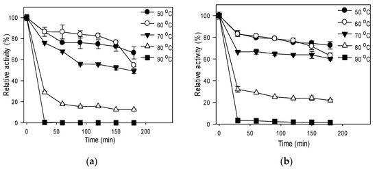 The effect of temperature on stability is shown in Figure 3; the residual activities of R5-SazCA were 66%, 54%, and 49% after 3 h incubation at 50, 60, and 70 °C, respectively (Figure 3a). The residual activities of R5-SazCA-SP were 73%, 63%, and 60% after 3 h incubation at 50, 60, and 70 °C (Figure 3b), respectively, clearly indicating that the thermal stability was improved after immobilizing the free enzyme with biomimetic silica. At 80 and 90 °C, both forms of R5-SazCA lost most of the activities within the first 30 min; however, the immobilized form still had higher residual activities. Improved thermal stability upon entrapment in biomimetic silica has been reported for other CA [18,21,22]; the enhanced thermal stability is often attributed to the steric constraints imposed by the crosslinking-network of silica, which aid in maintaining the stereo structure of the enzyme.