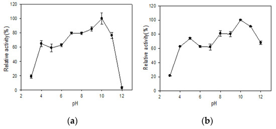 Effect of pH on stability. (a) R5-SazCA; (b) R5-SazCA-SP. The highest activity was set as 100%. The pH stability was determined by pre-incubating the enzyme solution with a buffer system at a volumetric ratio of 1:9 (enzyme: buffer system) for 30 min; the buffer system contained 150 mM glycine, 150 mM H3PO4, and 150 mM Tris-base with pH adjusted to 3–12. After incubation, the enzyme solution was assayed for its residual CO2 hydratase activity.