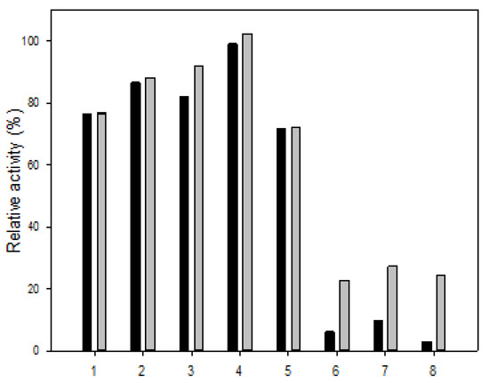 The effect of pH on stability is shown in Figure 4. Both R5-SazCA and R5-SazCA-SP were most stable at pH 10; they retained at least 59% of their activities in the range from 4 to 11. The entrapment in biomimetic silica improved the stability at pH = 11 and 12; 67% of the activity was retained for the immobilized form while the free form was almost completely inactivated at pH = 12. The improved pH stability was also reported for CA originating from cyanobacterium Synechocystis sp. entrapped in biomimetic silica [22].