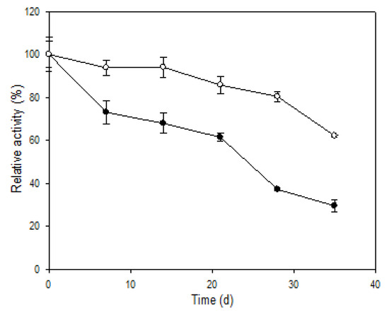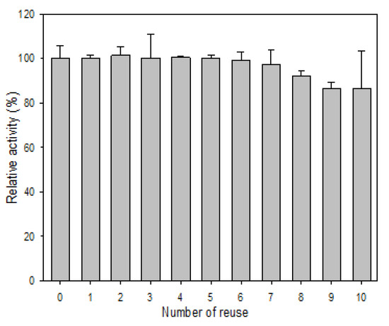 As for the reusability, R5-SazCA-SP showed almost no loss in activity during the first seven cycles of reuse (Figure 7); 86% of the activity remained even after ten cycles of reuse. The decrease in activity during recycling is partly due to the loss of silica particles in the recovery and washing process because the immobilized enzyme is very stable at 4 °C as indicated in the storage stability study. The reusability of R5-SazCA-SP is similar to that of BMC-SazCA (a fusion protein composed of an ectodomain of the human receptor-type tyrosine-protein phosphatase C, a cellulose-binding module, and SazCA) immobilized on microcrystalline cellulose beads, which showed a residual activity of 90% after ten cycles of reuse [25].