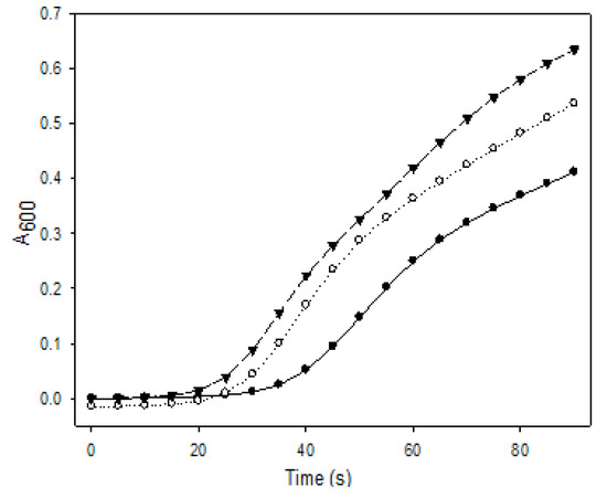 CO2 sequestration in CaCO3. Solid circle: negative control without the addition of enzyme; open circle: reaction catalyzed by R5-SazCA-SP; solid triangle: reaction catalyzed by R5-SazCA. The formation of CaCO3 was monitored turbidometrically at A600.