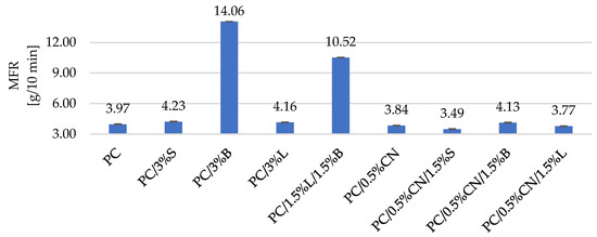 Summary of the obtained mass flow rate (MFR) results. PC—polycarbonate, S—modified silica, B—modified bentonite, L—lignin/SiO2 hybrid, CN—multiwalled carbon nanotubes.