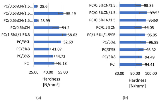 The introduction of fillers into the die increased the hardness of composites obtained by injection into the mold (Figure 5b) [41]. Only in the case of PC/0.5%CN and PC/0.5%CN/1.5%L compositions, a slight decrease in the value of the tested parameter can be observed, by 5.57% and 4.51%, respectively, compared to the unfilled polymer. Composite PC/0.5%CN/1.5%B obtained the highest result among the tested H = 97.53 N/mm2, while PC/3%L and PC/0.5%CN/1.5%S had a hardness of 96.89 N/mm2 and 96.69 N/mm2, respectively. However, in the case of samples obtained by 3D printing (Figure 5a) only a few of them, PC/3%L, PC/1.5%L/1.5%B, PC/0.5%CN and PC/0.5%CN/1.5%B, had a hardness better than that of PC. The highest result of 58.62 N/mm2 was achieved by the PC/1.5%L/1.5%B composite. The remaining composites, most likely due to the increase in surface roughness caused by the introduced fillers, especially 0.5%CN/1.5%S and 0.5%CN/1.5%L, in the MEM printing process obtained lower hardness results than PC [42]. Composites PC/0.5%CN/1.5%L and PC/0.5%CN/1.5%S are characterized by the highest surface roughness results of 18.65 µm and 15.65 µm, respectively (Table 4). The increase in roughness caused a decrease in the fluidity of the material, which is also confirmed by the discussed MFR results, which is most likely why the samples obtained from PC/0.5%CN/1.5%S and PC/0.5%CN/1.5%L composites in 3D printing obtained less precise geometry of samples (Table 4).