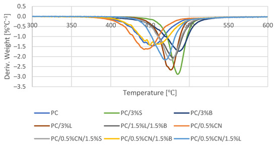 The polymer and all composites are characterized by a single-stage thermal decomposition. The degradation process step (Figure 10) shows a slight intense peak. This peak appears in the temperature range of 375–525 °C, during which there is a loss in the range from 38% for PC/0.5%CN to 48% for PC/3%B of the initial sample mass (Δm1) for the tested composites (Table 5). The unmodified polymer is characterized by high thermal stability as the PC decomposition begins at 410 ℃. The introduced additives increased the thermal stability of the material for composites, except for PC/0.5%CN. This indicates a positive interfacial interaction between the filler and the PC matrix [49]. Such a phenomenon proves the appropriate dispersion of additives in the polymer matrix, which is also confirmed by the analysis of mechanical properties and SEM. The increase in the thermal stability value reflects the low thermal conductivity of the S, B and L additives. The highest result was obtained for the PC/3%S 453.17 ℃ composite, which may be related to the relatively large surface of the silica filler. The presence of 3%S in the polymer matrices leads to the creation of an interlayer zone on the filler surface, and thus to the immobilization of polymer chains on the additive surface [24,25]. Moreover, the presence of 3%L also substantially increases thermal stability, the beginning of the 445 ℃ degradation process, which may be related to the formation of aromatic charred lignin radicals that form a protective coating, and therefore, the material decomposes at higher temperatures [25]. Similarly selected hybrid fillers 0.5%CN/1.5%S and 0.5%CN/1.5%L increased thermal stability. The introduced multiwalled carbon nanotubes were not functionalized or modified prior to mixing, and therefore the TGA curves for the PC and PC/0.5%CN samples showed only a slight difference. The decrease in the value of thermal stability is a reflection of the high thermal conductivity of nanotubes, which can form locally high temperatures in their larger CN clusters, which was not observed in the case of the PC polymer matrix [50]. Observing the CN-containing composite (PC/0.5%CN), it showed greater weight loss (Table 5) due to the low overheating effect [51].