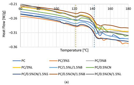 The thermal effect of the materials was investigated using a DSC calorimeter. The thermograms are characterized by the appearance of an endothermic peak at about 144 °C, which can be attributed to the glass transition temperature (Tg) of the PC phase (Figure 11). The obtained result is confirmed by data obtained by other scientists [49,52,53]. Maintaining the same Tg values for all tested systems during the first and second heating (Table 6) indicates that neither the content nor the modification of the filler surface affects the mixability [50]. Analyzing the thermograms obtained for the composites, one can also observe the second endothermic peak at a temperature of about 122 °C, which corresponds to the melting point of the added additive. For all composites containing different fillers, a transition at this temperature was observed, and therefore, the peak most likely comes from the compatibilizer introduced into the polymer matrix, polyethylene grafted with maleic anhydride, more so as polyethylene has a melting point of about 120° [54,55].