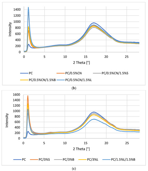 WAXS patterns: (a) fillers; (b) PC and composites with the addition of modified S, B, L and CN fillers; (c) PC and composites with the addition of modified fillers S, B and L.