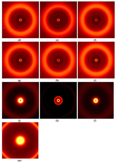 Two-dimensional WAXS images: (a) PC; (b) PC/3%S; (c) PC/3%B; (d) PC/3%L; (e) PC/1.5%L/1.5%B; (f) PC/0.5%CN; (g) PC/0.5%CN/1.5%S; (h) PC/0.5%CN/1.5%B; (i) PC/0.5%CN/1.5%L; (j) S; (k) B; (l) L; (m) CN.