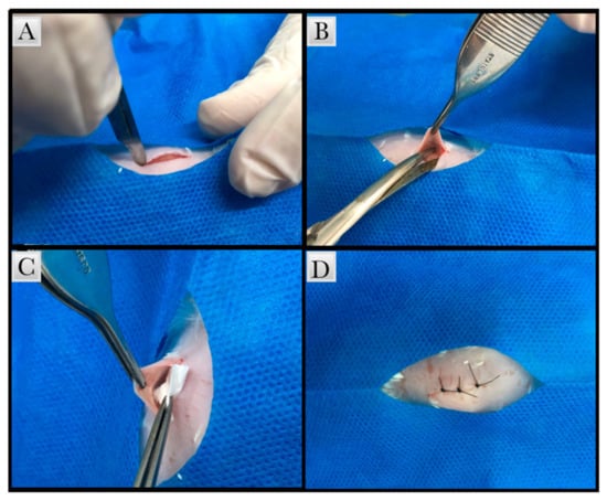 Surgical procedure (A) Subcutaneous linear incisions were made using a no. 15 C scalpel blade in the dorsal region of the animal. (B) Divulsion of the subcutaneous tissue was performed with a blunt-tipped scissors. (C) Membrane insertion (D) Suture of the implantation area with 5-0 Nylon.