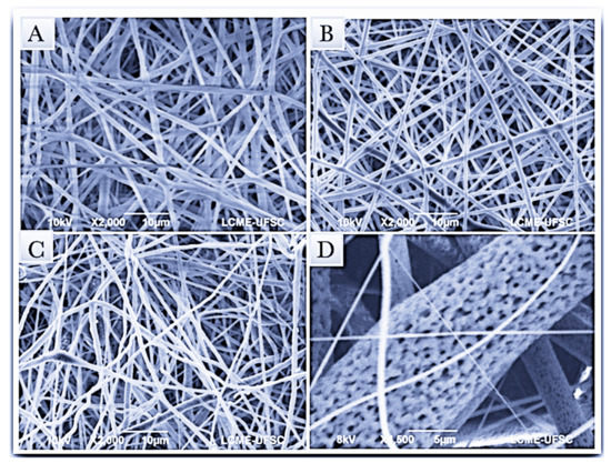 Scanning Electron Micrographs (SEM) of the electrospun membranes (A) Electrospun PLGA loaded with tea tree essential oil, (B) Electrospun PLGA loaded with furanone, (C) Electrospun pure PLGA. (D) Porous surface of the electrospun fibers.