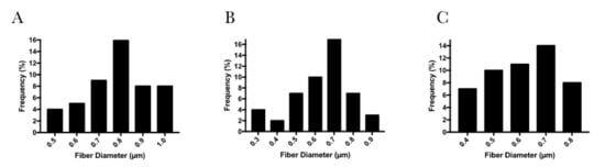 Fiber Diameter Distribution of electrospun membranes. (A) Electrospun PLGA loaded with tea tree essential oil, (B) Electrospun PLGA loaded with furanone, (C) Electrospun pure PLGA.