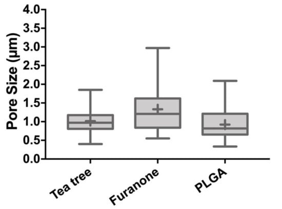 Pore sizes were analyzed and the average pore diameter of the electrospun fiber membranes are shown in Figure 4. The average pore diameters of pure PLGA electrospun fiber membranes was 0.91 ± 0.39 µm, whereas the tea tree oil addition slightly increased the pore size to 1.01 ± 0.28 µm. Furanone addition exhibited the highest measures for pore average (1.33 ± 0.59 µm) and maximum pore size of 2.97 µm. Additionally, the maximum pore size of tea tree samples (1.85 µm) and pure PLGA fiber membranes (2.09 µm) were reduced. However, no significant differences between electrospun fiber membranes were found.