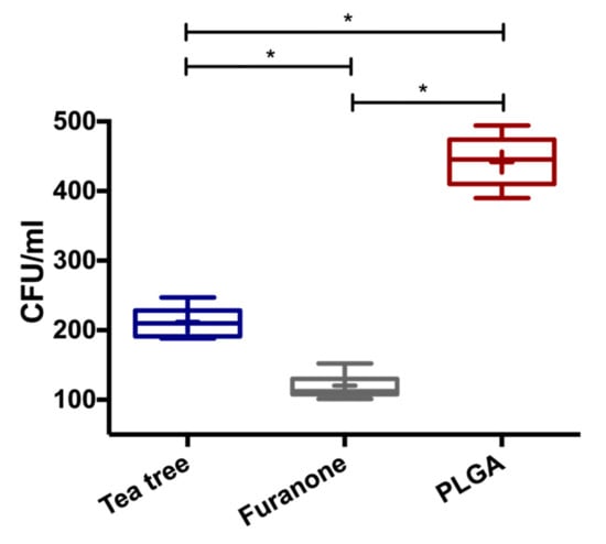 The antibiofilm activity was assessed by CFU/mL counting post bacterial disaggretion from the electrospun membrane surfaces. As presented in Figure 5, the mean of adhered viable cells in the S. mutans biofilm was 211 and 120 CFU/mL over tea tree and furanone PLGA loaded membranes, respectively. In contrast, pure PLGA exhibited 441 CFU/mL. During 48 h incubation, the tea tree and furanone antibiofilm membranes presented a significant decrease in bacterial attachment (p < 0.01).