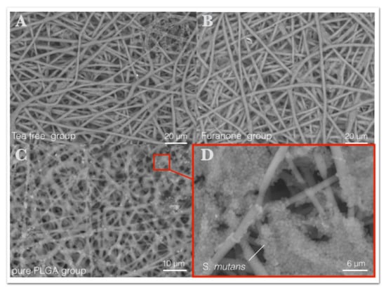 Scanning Electron Microscopy (SEM) images of electrospun membrane surfaces revealed the patterning of S. mutans biofilms formed, as shown in Figure 6A–D. A significant amount of biofilm accumulation was noticed in membrane samples corresponding to pure PLGA (Figure 6C,D) contrasting with surfaces of electrospun membranes loaded with biofilm inhibitors—tea tree and furanone, which appeared visibly free of S. mutans colonies (Figure 6A,B). S. mutans colonies had grown agglomerate on fibers surface, originated from the electrospinning process, showing itself susceptible to accumulation of S. mutans.