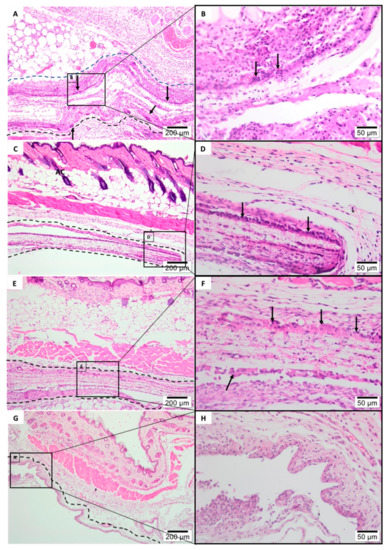 Histology of subcutaneous evaluation of 9-Weeks Post-implantation. Photomicrographs (optical microscopy) stained with hematoxylin/eosin of the membrane implantation area (dotted line) at ×40/×400 magnification. (A,B) Tea tree Experimental Group, (C,D) Furanone Experimental Group, (E,F) Pure PLGA Experimental Group, (G,H) Pratix Experimental Group.