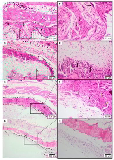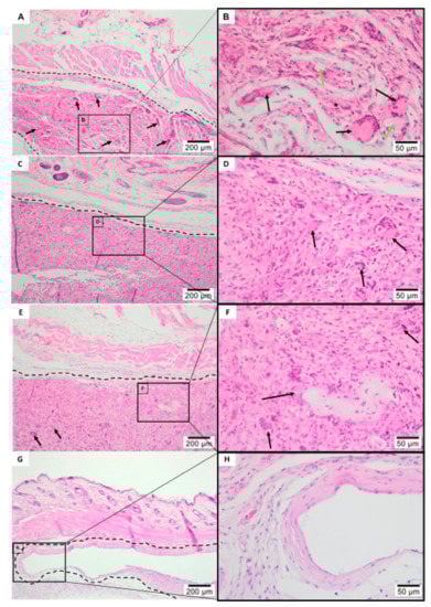 All membrane groups exhibited a moderate inflammatory infiltrate, with exception of the tea tree-based PLGA group (Figure 7A,B) which showed an intense inflammatory infiltrate, predominantly mononuclear (especially with the recruitment of macrophages lymphocytes). A significant amount of multi-nucleated giant cells (see black arrows) was noticed on the experimental electrospun membranes surfaces (Figure 7A–F) contrasting with Pratix (Figure 7G,H). Fiber layer’s structure, originated from the manufacturing electrospinning process, were susceptible to accumulation of mesenchymal cells (Figure 7F). No fibrosis, fatty infiltrate, or tissue necrosis were observed in any experimental groups.