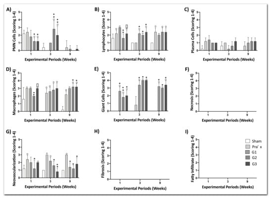 Inflammatory cells response (A–E) and overall tissue reaction (F–I) after experimental periods of 1, 3 and 9 weeks. Data ± standard deviation (p < 0.05). Sham group was considered an experimental control. (°) represents significantly difference when compared to the Sham group at same experimental period; (*) represents significantly difference when compared to the Pratix group at same experimental period; (+) represents significantly difference when compared to the G1 group at same experimental period; (*) represents significantly difference when compared to the G2 group at same experimental period.