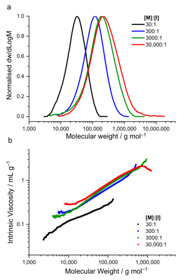 (a) SEC traces and (b) Mark–Houwink–Sakurada (MHS) plots for PLGA25 synthesised using various [M]:[I] ratios. SEC analysis was performed in DMSO at 80 °C using a PMMA calibration. All polymers were synthesised at 150 °C for 2.5 h under N2, using an [M]:[C] = 6500:1.