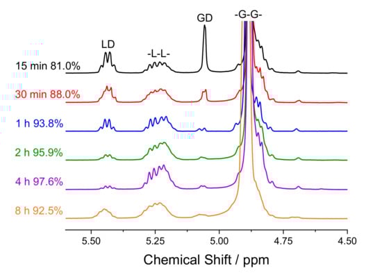 A series of experiments were performed to examine the effects of reaction time and temperature on monomer conversion. To begin, PLGA25 was polymerised at 150 °C using an [M]:[C] = 6500:1 and [M]:[I] = 30,000:1 at times ranging from 15 min to 8 h. The 1H NMR spectra of these polymers revealed how conversion changed with time, Figure 2. Conversion initially increased, reaching a peak (CLD+GD = 97.6%) at 4 h, and then fell to 92.5% after 8 h due to thermal depolymerisation. Similarly, both Mn and Mw initially increased, but then started to decrease after 1 h, most likely due to random chain scission during the reaction. However, the conversion improved significantly during this time, increasing from 93.8% to 97.6% when the reaction time was increased from 1 to 4 h. Similar observations of reductions in molecular weight and conversion after certain periods of time have been reported previously for PLA and PLGA synthesised using Sn(Oct)2 [23,29,30,31].