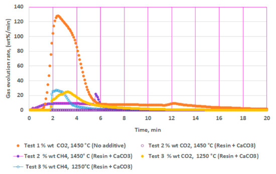Figure 2 illustrates the results from isothermal calcination reactions of CaCO3 with and without the plastic resin (resin). Figure 2 shows calcination of CaCO3 (2.36 g) at 1450 °C without the resin (test 1), calcination of CaCO3 (2.36 g) with the resin (2.37g) at 1450 °C (test 2), and calcination of CaCO3 (2.36 g) with the resin (2.06 g) at 1250 °C (test 3). Test 2 showed almost no traces of CO2 but only CH4, while test 3 showed reduced amounts of CO2 and almost equal amounts of CH4. These figures show the effects of the resin and the temperatures in suppressing the CO2 emissions to almost zero at high temperatures during the calcination. In these tests (tests 3 and 4), the resin quantity was kept almost equal or slightly less than the CaCO3 at 2.36 g.