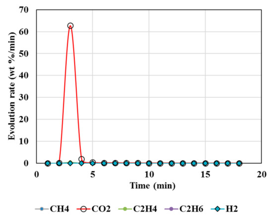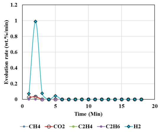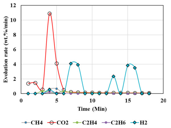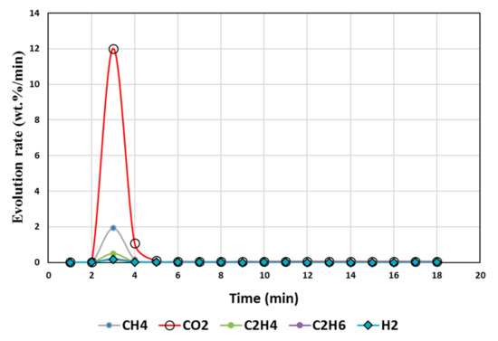 The volatiles from the MgCO3 +resin +biomass system were measured with MTI Activon M200 series micro gas chromatograph (GC) instrument. The thermal conductivity detectors with a 5A molecular sieve column at 60 °C was used to measure H2 and CO. A Poraplot U column at 40 °C was used to measure CO2, CO, CH4, C2H4, and C2H6. The evolution rate was determined as the wt.% of initial Wt. of sample/min.