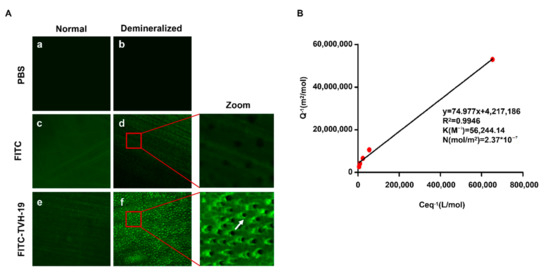 Adsorption capability of peptide on dentin surface and HA. (A) shows CLSM images of sound dentin surface (Aa), non-treated demineralized dentin sample surface (Ab), FITC-treated normal dentin surface (Ac), FITC-treated demineralized dentin surface (Ad), FITC-labelled TVH19-treated normal dentin surface (Ae) and FITC-labelled TVH-19-treated demineralized dentin surface (Af). The arrow shows that the FITC-labelled TVH19 accumulated on the peritubular dentin. (B) Shows the Langmuir adsorption curve of TVH19 to HA. R2 is the correlation coefficient. The affinity of TVH-19 molecules for HA adsorption sites (K) and the maximum number of adsorption sites per gram of HA (N) were calculated from the best-fit regression line.