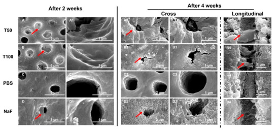 SEM images of the acid-etched tooth dentin surfaces (A) treated with 50 μg/mL TVH-19, (B) 100 μg/mL TVH-19, (C) treated with PBS and (D) 1000 ppm NaF, after being soaked in artificial saliva for 2 weeks (A–D,A1–D1) and 4 weeks (A2–D2,A3–C3) respectively. SEM images of longitudinal section of dentin tubules treated with (A4) PBS, (B4) 50 μg/mL TVH-19, (C4) 100 μg/mL TVH-19 and (D4) 1000 ppm NaF, after mineralization in artificial saliva for 4 weeks. The area indicated by the arrow is the remineralized material.