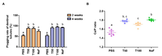 The plugging rates of all groups after remineralization are shown in Figure 4A. It was considered that different kinds of group exerted different blocking effects on dentinal tubules. After 2 weeks of mineralization, compared with the control, the plugging rates in the TVH-19 groups were significantly higher than those in the PBS group and slightly higher than that of the NaF group (p < 0.05). However, there was no significant difference in plugging rates between the NaF group and the TVH-19 group after 4 weeks of mineralization.