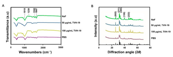 The ATR-FTIR spectra of the demineralized dentin after remineralization are shown in Figure 4B. The peak at 1018 cm−1 represented the anti-symmetric stretching vibration peak of PO43−. The peak at 1647 cm−1 represented the characteristic peak of the amide I band while that at 1550 cm−1 represented the characteristic peak of the amide II band. The characteristic peak at 1239 cm−1 corresponded to the amide III band. The dentin slices were treated with TVH-19 and NaF. The intensity of the peak at 1018 cm−1 was found to be significantly enhanced, which is characteristic of HA (Figure 5A).