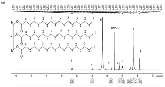In Figure 1a, the main characteristic of JO was shown by the proton of the unsaturated carbon double bond (–HC=CH–) that was detected at 5.35 ppm under 1H NMR. Apart from that, the signal of the methylene group adjacent to the proton of the carbon double bond (RCH2CH=CH–) was spotted at 2.02 ppm. Meanwhile, the peak of 2.75 ppm was attributed to the methylene protons between the two carbon double bonds (=CH–CH2–CH=), which proved the existence of linoleic fatty acid in the triglyceride of JO molecules. This result was comparable with other studies on pure JO [43,44].