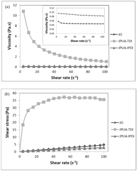 A rheological study was performed to provide information about how the processing condition such as shear rate and temperature affects the fluid behaviour. Initially, the viscosity and shear stress of the JO, JPUA-TDI and JPUA-IPDI in their virgin form were determined over a shear rate range from 0 to 100 s−1 at 25 °C. The rheogram is displayed in Figure 3.
