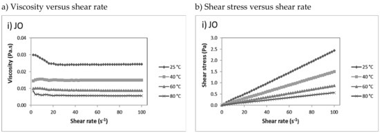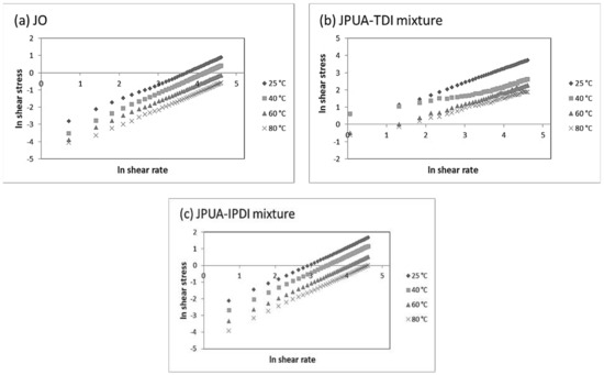 The viscosity and shear stress of the JO, JPUA-TDI mixture and JPUA-IPDI mixture were examined at 25 °C, 40 °C, 60 °C and 80 °C, as shown in Figure 5. Those temperatures were selected to determine the flow behaviour of the samples at both room temperature and during processing parameters [50].