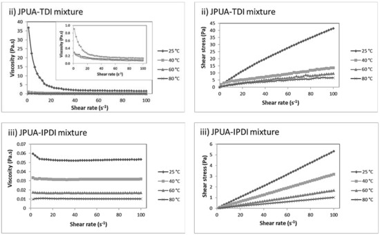 Trends of (a) viscosity and (b) shear stress at shear rates of 0 to 100 s−1 measured at various temperatures. Each set of experiments were conducted on i) JO, ii) JPUA-TDI mixture and iii) JPUA-IPDI mixture respectively.