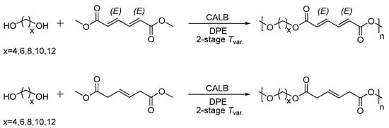 - Jiang, Y.; Woortman, A.J.J.; Alberda van Ekenstein, G.O.R.; Loos, K. Environmentally benign synthesis of saturated and unsaturated aliphatic polyesters via enzymatic polymerization of biobased monomers derived from renewable resources. Polym. Chem. 2015, 6, 5451–5463. [Google Scholar] [CrossRef]