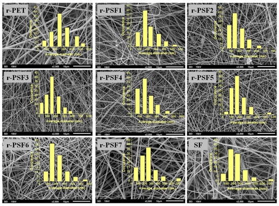 As can be seen from Table 2, the estimated pore size of r-PET and SF mats was larger than that of fibrous composites (except r-PSF7) and showed a decreasing trend with the decrease of fiber diameter. This trend is consistent with other electrospun nanofiber membrane investigations, where the larger pore size is obtained when fiber diameter increased [43].
