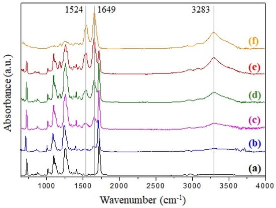 Enhancing of the bands in the case of r-PSF4, r-PSF5, r-PSF6, r-PSF7 (Figure 2b–e) belonging for the amide groups of silk at 1240 cm−1 (amide III, C–N stretching), 1649 cm−1 (amide I, C=O stretching), 1524 cm−1, and 3283 cm−1 (amide II, N–H bending) correspond to the increasing of SF concentration, which was attributed to the random coil, α-helix, and β-sheet structure of silk fibroin [58,87,88]. These bands are compared to the bands of pure silk fibroin located in the spectrum depicted in Figure 2f. Electrospun mats with a lower concentration of SF than 28.5% (V/V) were investigated by ATR-FTIR as well; however, the typical bands at 1524 cm−1 and 1649 cm−1 have not been observed yet, and therefore the spectra are not shown here. The ATR-FTIR measurements of prepared membranes were carried out from both sides of the membranes; however, the results are compared and therefore are not presented.