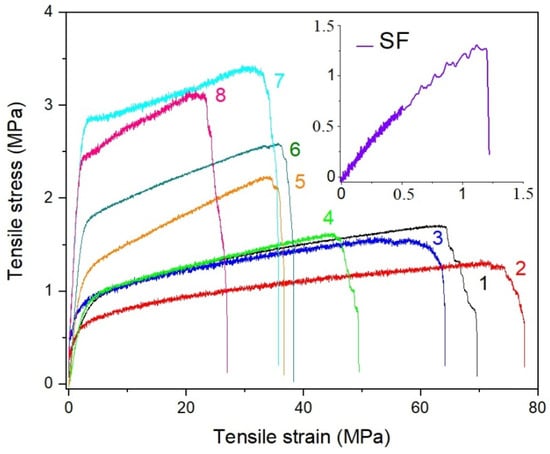 Stress–strain curves for r-PET electrospun mats contained (1) r-PET pure, (2) r-PSF1, (3) r-PSF2, (4) r-PSF3, (5) r-PSF4, (6) r-PSF5, (7) r-PSF6, (8) r-PSF7. The inset shows the stress–strain curve of crude electrospun SF.
