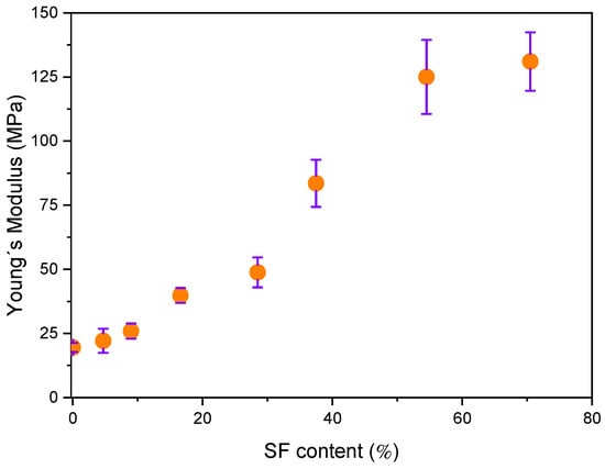 Young’s modulus (E) of the electrospun pure r-PET, r-PSF mats, containing different SF amounts is shown in Figure 4. Young´s modulus is attributed to the strength of the interaction between fibers within the material that does not significantly depend on its thickness [89]. It was observed that increasing SF content in r-PSF samples increases the E. Similar behavior was reported by Gobin et al. [90], which attributed these changes to more numerous interactions of SF, with presented chitosan in the form of strong molecular hydrogen bonding. Hydrogen interactions can occur not only at the polymer filler interfacial, but also in the form of mutual particle interactions, especially at higher fibroin concentrations resulting in significant increase in stiffness.