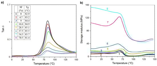 Evolution of loss factor (tan δ) (a) and storage modulus (b) with temperature of electrospun membranes containing (1) r-PET, (2) r-PSF1, (3) r-PSF2, (4) r-PSF3, (5) r-PSF4, (6) r-PSF5, (7) r-PSF6, (8) r-PSF7.