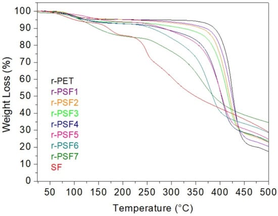The TGA curve of the electrospun r-PET shows stability up to the decomposition temperature at around 400 °C. After that, the degradation reaction ceased at a residue accumulation of 20%. It is in good agreement with published results when thermal degradation occurs under an inert environment [92]. Subsequently, the decomposition temperature decreases with the increasing concentration of SF in the investigated sample; however, the accumulation of residue is increasing. In r-PSF6, the decomposition temperature is around 250 °C, and the accumulation of residue at 500 °C is 30%. Unlike the r-PET, the sample r-PSF7 exhibits two steps of weight loss. First is at 100 °C, and this decreasing passes into the plane between 180–250 °C. The weight loss is 15%. Then, the second and most significant weight loss starts at 250 °C, corresponds to the degradation of silk. The accumulation weight loss at 500 °C is 35%. The TGA curve of r-PSF7 exhibits the similarities of both types of polymers, r-PET, and SF as well. In the TGA curve of SF, the decomposition is also in the two steps; however, the plane after the first weight loss is shorter, between 180–230 °C, as it was published by [93,94].