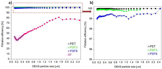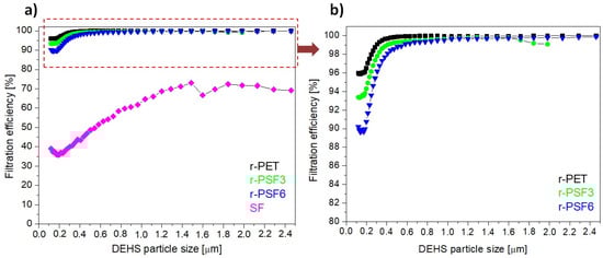 Filtration efficiency of investigated samples with basis weights between 10–12 g·m−2; (a) r-PET (black sign), r-PSF3 (green sign), r-PSF6 (blue sign), SF (magenta sign); (b) detail of the curves at high efficiency.