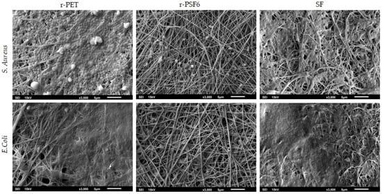 Antimicrobial activity of electrospun pure r-PET, r-PSF6, and SF pure fibrous mats was determined with adherence to the procedure following ISO 22196:2011 for S. aureus and E. coli [63]. Bacterial suspensions were prepared at concentration between 2.5 x 105 to 10 × 105 cells·mL−1. 400 μL of the suspension was put on the surface of specimen 40 mm × 40 mm in each sample, covered with a square piece of polyethylene film. The samples and the polyethylene films were placed under UV light for 30 min to sterilize them just before the experiments. After the contact time of 24 h, the specimens (samples) were rinsed with CPLP broth (10 mL; Casein-peptone lecithin polysorbate broth (base)) on a petri dish, and the value for CFU·mL−1 was determined. Log reduction in the number of living and viable cells of tested bacteria (R) was calculated according to Equation (2):