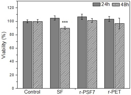 Cytotoxicity of selected samples r-PET, r-PSF6, and SF were determined using the MTT method. Briefly, 2 × 104 cells were seeded in 96-well plates and cultured in a complete DMEM medium. The studied r-PET, r-PSF6, and SF were then added, and the cells were incubated at 37 °C in a 5% CO2 atmosphere for 24 and 48 h. Next, the samples were washed with phosphate-buffered saline (PBS) at the indicated time point, followed by incubation with 1 mg·mL−1 of MTT for 4 h. Then, the MTT was removed, and the formazan crystals were dissolved with dimethyl sulfoxide for 30 min. Absorbance at a wavelength of 540 nm was measured using an xMark microplate Spectrophotometer (Bio-Rad Laboratories, Inc., Hercules, CA, USA), and background absorbance at 690 nm was subtracted. The results are presented as mean ± SD in quadruplicates (n = 4) from three independent experiments.