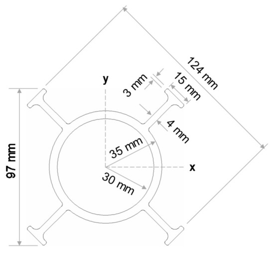 The externally flanged FRP tubes were composed of glass fibre reinforced polymer and vinylester resin and were manufactured using pultrusion process. Most of the fibres were oriented in a longitudinal direction while a small quantity of transverse fibres provided lateral stability. The cross-sectional area and moment of inertia with respect to the x-axis are approximately 1585 mm2 and 888,000 mm4, respectively. The mechanical properties of externally flanged FRP tubes were obtained from the technical data sheet [31] provided by the manufacturer as tabulated in Table 1 and the dimensions are provided in Figure 2.