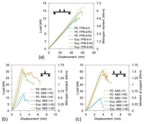 The bending strengths of the hollow, normal-concrete-filled and rubberised-concrete-filled specimens were determined from the load carrying capacities of FPB-8-H, FPB-8-NC and FPB-8-RC beams, respectively, as these specimens exhibited the highest bending moment compared to other test setups indicated in Table 2. On the other hand, two different shear properties such as horizontal plane shear strength and vertical plane shear strength were evaluated from the short beam shear (SBS-1-H, SBS-1-NC and SBS-1-RC) and asymmetrical beam shear (ABS-1-H, ABS-1-NC and ABS-1-RC) tests, respectively. The bending strength (), horizontal plane shear strength () and vertical plane shear strength () can be evaluated using Equation (4) to Equation (6). In Equation (4) to Equation (6), , and are the maximum bending moment, outermost fibre distance from neutral axis and modulus of elasticity of the FRP tube; , and are the maximum transverse shear force, width of section and sum of the products of first moment of area and corresponding modulus of elasticity; and are the cross-sectional areas of the FRP tube and infill concrete while or is the shear modulus for the FRP tube or infill concrete, respectively. The strength and stiffness of the beams are provided in Table 4. These properties were not compared with the FE results as the load–displacement behaviour is already verified, being the function of strength and stiffness. Since strength and stiffness are the important properties of a structure, it is therefore necessary to evaluate them.
