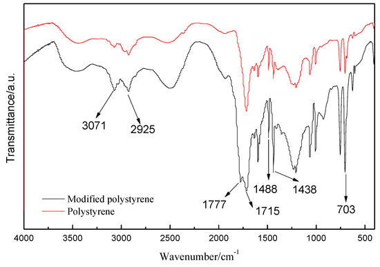The IR characterization was used to confirm the functional groups of the modified polystyrene. The obtained spectra were shown in Figure 3. The IR spectrum of the modified polystyrene shows absorption bands at 1438 cm−1 and 1488 cm−1, which are assigned to the C=C vibration. The absorption peaks at 1715 cm−1 and 1777 cm−1 are assigned the symmetric and antisymmetric stretching vibration of C=O groups in acetic anhydride. In addition, the absorption peaks at 703 cm−1 are the monosubstituted group of the benzene ring. Finally, the absorption bands at 2925 cm−1 and 3071 cm−1 are the characteristics for the CH3 and CH2 groups, respectively. The characteristic peaks are basically consistent with the standard spectra of modified polystyrene by acetic anhydride. The appearance of a new peak at 1777 cm−1 in the IR spectrum of the modified polystyrene in comparison with the IR spectrum of polystyrene indicates a successful acetylation modification of the polystyrene [12].