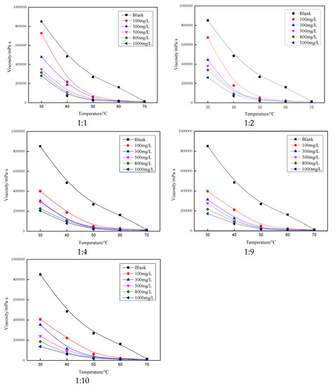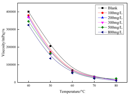 Five crude oil flow improvers obtained by dissolving modified polystyrene in diesel oil at different volumes were subjected to the various concentrations to compare the effect of viscosity reduction. From Figure 6, it can be seen that the crude oil flow improvers at different volumes had a significant influence on the viscosity reduction of Henan oil samples. When the temperature is below 50 °C, the viscosity of this oil sample is not only influenced by the viscosity reducer concentration, but also more significantly by the temperature. When the temperature is higher than 50 °C, the crude oil viscosity decreased significantly. Further was observed that the crude oil flow improver had a significantly lower viscosity reduction effect on Henan oil samples [14]. The viscosity reduction effect of all five crude oil flow improvers increased with increasing concentration of flow improver.