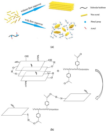 The action mechanism hypothesis of the flow improver is shown in Figure 8. The non-polar groups of the flow improver can interact with the long-chain alkanes, which can be adsorbed on the surface of the wax crystals. Thus, changing the growth mode of the wax crystal and preventing the paraffin from aggregating into larger flaky crystals (as shown in Figure 8a). Furthermore, flow improvers can reduce the viscosity of crude oil by affecting the interaction between colloidal asphaltene molecules. The benzene ring structure contained in the flow improver weakens the supramolecular aggregates formed between gummy asphaltene molecules due to π-π stacking [19,20]. Modified polystyrene contains polar groups that form stronger hydrogen bonds with gum and asphaltene molecules, thus breaking up the aggregates formed by overlapping planes and thus reducing viscosity (as shown in Figure 8b).