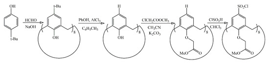- Percec, V.; Bera, T.K.; De, B.B.; Sanai, Y.; Smith, J.; Holerca, M.N.; Barboiu, B.; Grubbs, R.B.; Fréchet, J.M.J. Synthesis of functional aromatic multisulfonyl chlorides and their masked precursors. Org. Chem. 2001, 66, 2104–2117. [Google Scholar] [CrossRef]