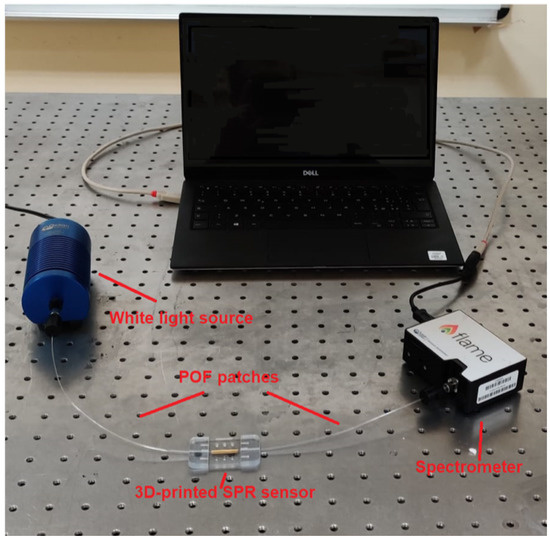 Experimental setup used to test the 3D-printed plasmonic sensor (plastic optical fiber (POF); surface plasmon resonance (SPR)).